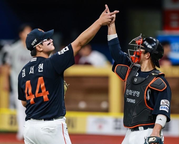 승리를 지킨 김서현(왼쪽). [사진=한화 이글스] |