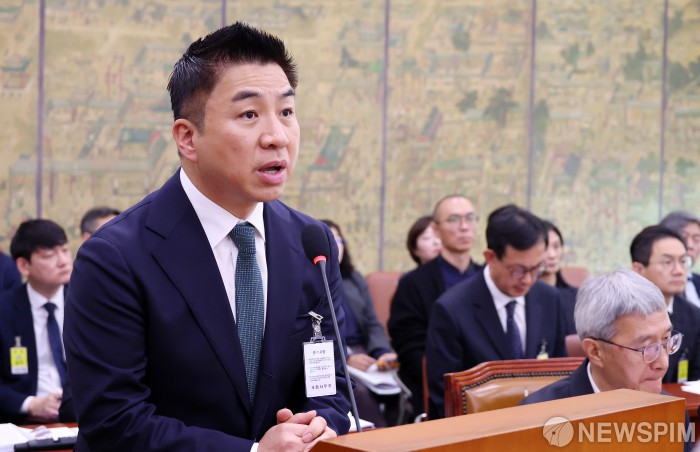 [서울=뉴스핌] 정일구 기자 = 정용석 국립박물관문화재단 사장이 22일 서울 여의도 국회 문화체육관광위원회에서 열린 국립중앙박물관 등에 대한 국정감사에서 '김건희·이배용 경회루 비공식 방문' 관련 이기헌 더불어민주당 의원 질의에 답하고 있다. 2025.10.22 mironj19@newspim.com