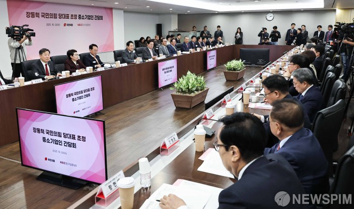 [서울=뉴스핌] 윤창빈 기자 = 장동혁 국민의힘 대표가 22일 오후 서울 여의도 중소기업중앙회에서 열린 중소기업인 간담회에서 인사말을 하고 있다. 2025.10.22 pangbin@newspim.com