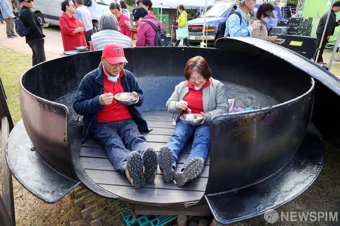 [서울=뉴스핌] 양윤모 기자 = 22일 오후 경기도 이천시 이천농업테마공원에서 열린 '제24회 이천쌀문화축제'중 '가마솥이천원이천명' 행사에 참여한 방문객들이 대형솥안에서 식사를 하고있다. '맛과 멋이 어우러진, 쌀로 잇는 즐거움'이란 주제로 열리는 올해 축제는 다양한 가마솥밥이천원이천명, 600미터 무지개가래떡행사 등 다양한 참여 및 체험 행사와 전통 공연 등으로 26일까지 5일간 열린다. [사진=이천시청] 2025.10.22 yym58@newspim.com