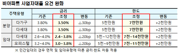 먼저 사업자 부담을 완화하기 위해 2027년 말까지 비(非)아파트 건설자금의 대출 금리를 20~30bp(연 0.2~0.3%) 인하하고 대출 한도는 2000만원 상향한다. 민간사업자가 비(非)아파트를 분양하는 경우 가구당 최대 7000만원까지 대출을 받을 수 있으며 이자율은 연 3.5%로 지원한다.