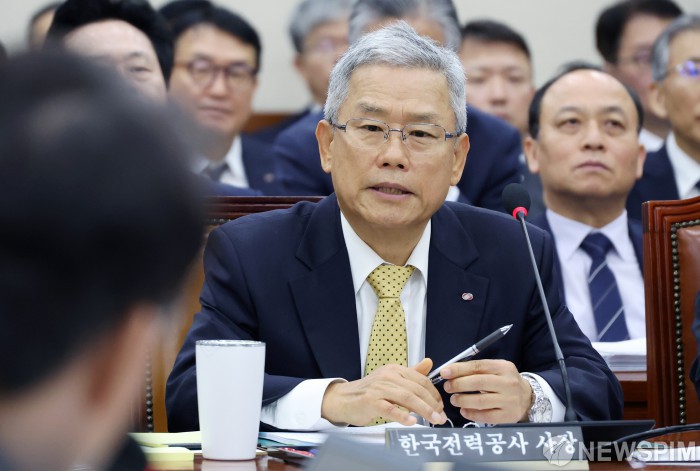 [서울=뉴스핌] 정일구 기자 = 김동철 한국전력공사 사장이 23일 서울 여의도 국회 기후에너지환경노동위원회에서 열린 국정감사에서 의원 질의에 답하고 있다. 2025.10.23 mironj19@newspim.com