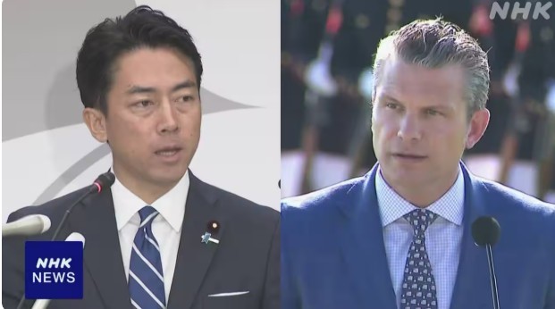 | 고이즈미 신지로 일본 방위상(왼쪽)과 피트 헤그세스 미국 국방장관 [사진=NHK] |
