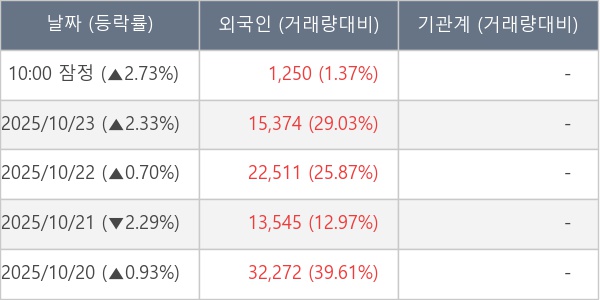 [서울=뉴스핌] 로보뉴스 = 24일 10시 15분 현재 아시아종묘(154030)는 전일 대비 2.73% (현재가 2,255원) 상승했고, 외국인이 최근 5일 연속 순매수(누적 84,952주, 잠정) 행진을 하고 있다.