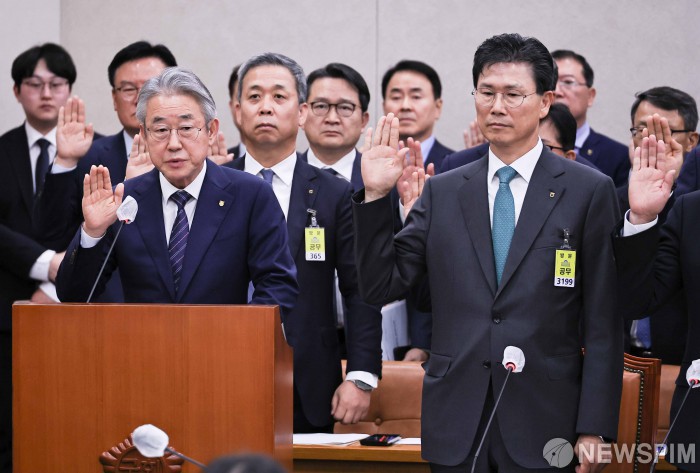 [서울=뉴스핌] 윤창빈 기자 = 강호동 농업협동조합중앙회장 등 피감기관 증인들이 24일 오전 서울 여의도 국회에서 열린 농림축산해양수산위원회의 농업협동조합중앙회 등에 대한 국정감사에서 선서를 하고 있다. 2025.10.24 pangbin@newspim.com