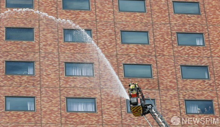 [서울=뉴스핌] 김학선 기자 = 24일 오전 서울 중구 신라호텔에서 열린 '2025 안전한국훈련'에서 소방대원들이 고가사다리차와 소방차를 동원해 화재 진압 및 인명 구조 훈련을 실시하고 있다. 2025.10.24 yooksa@newspim.com