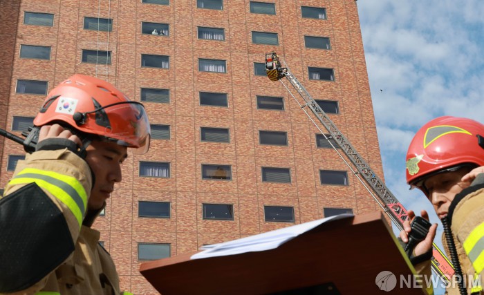 [서울=뉴스핌] 김학선 기자 = 24일 오전 서울 중구 신라호텔에서 열린 '2025 안전한국훈련'에서 소방대원들이 고가사다리차와 소방차를 동원해 화재 진압 및 인명 구조 훈련을 실시하고 있다. 이번 훈련은 호텔 주방에서 음식 조리 중에 화재가 발생한 상황을 가정해 진행됐다. 2025.10.24 yooksa@newspim.com