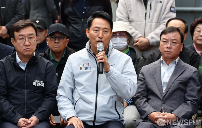 [서울=뉴스핌] 양윤모 기자 =오세훈 서울시장이 24일 오전 노원구 상계5 재정비촉진구역 현장을 방문해 주민간담회를 개최하고 있다. 서울 노원구 상계동 109-43번지의 상계5구역은 재개발을 통해 지하 3층~지상 39층 14개동, 2016가구 및 부대복리시설로 조성된다. [공동취재] 2025.10.24 yym58@newspim.com