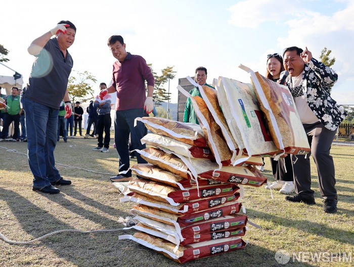 [서울=뉴스핌] 양윤모 기자 =24일 오후 경기도 이천시 이천농업테마공원에서 열린 '제24회 이천쌀문화축제'에 참여한 각 읍면동 대표가 주어진 시간에 쌀푸대를 누가 많이 쌓아올리냐로 승부가 갈리는 만석꾼 놀이를 하고 있다. '맛과 멋이 어우러진, 쌀로 잇는 즐거움'이란 주제로 열리는 올해 축제는 다양한 참여 및 체험 행사와 전통 공연 등으로 26일까지 열린다. [사진=이천시청] 2025.10.24 yym58@newspim.com