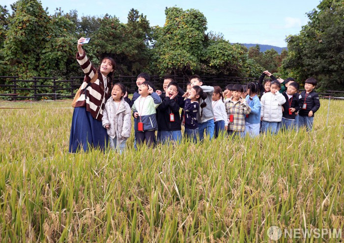 [서울=뉴스핌] 양윤모 기자 =24일 오후 경기도 이천시 이천농업테마공원에서 열린 '제24회 이천쌀문화축제'를 찾은 어린이들이 다랭이논을 배경으로 사진을 촬영하고 있다. '맛과 멋이 어우러진, 쌀로 잇는 즐거움'이란 주제로 열리는 올해 축제는 다양한 참여 및 체험 행사와 전통 공연 등으로 26일까지 열린다. [사진=이천시청] 2025.10.24 yym58@newspim.com