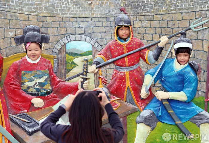 [서울=뉴스핌] 양윤모 기자 = 24일 오후 부산시 동래구(구청장 장준용)가 주최한 '제31회동래읍성역사축제'를 찾은 어린이들이 장군상 조형물에서 기념사진을 촬영하고 있다. ‘동래성 사람들, 역사와 미래를 잇다’라는 새로운 슬로건으로 열리는 올해 축제는 동래성 항전 이야기에 4차 산업 기술을 접목한 새로운 체험과 공연으로 오는 26일까지 동래문화회관, 동래읍성광장, 명륜1번가, 온천천카페거리, 온천장, 청소년센터, 혁신어울림센터 일원에서 진행된다. [사진=동래구청] 2025.10.24 yym58@newspim.com