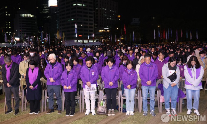 [서울=뉴스핌] 김학선 기자 = 10.29 이태원참사 유가족과 시민들이 25일 오후 서울 중구 서울광장에서 열린 10.29 이태원참사 3주기 시민추모대회에서 희생자들을 추모하며 묵념하고 있다. 2025.10.25 yooksa@newspim.com