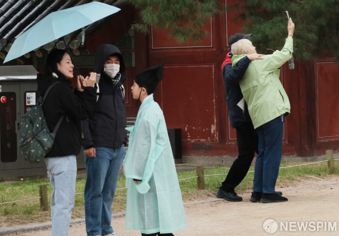 [서울=뉴스핌] 이길동 기자 = 시월의 마지막 휴일인 26일 오전 서울 종로구 창경궁 을 찾은 외국인 관광객이 조선시대 유생 중양절 특별 과거시험 ‘구일제’ 열린 장소에서 셀카를 찍고 있다.있다. 2025.10.26 gdlee@newspim.com