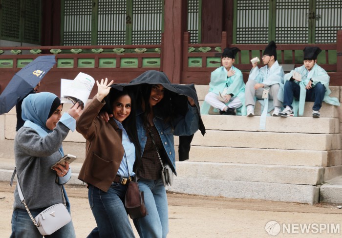 [서울=뉴스핌] 이길동 기자 = 시월의 마지막 휴일인 26일 오전 서울 종로구 창경궁 을 찾은 외국인 관광객들이 갑자기 내리는 비를 겉옷을 덮어 피하고 있다. 2025.10.26 gdlee@newspim.com