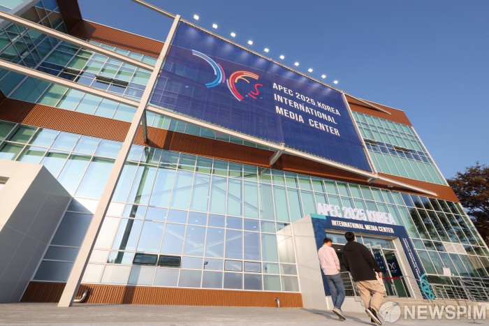 [서울=뉴스핌] 2025 경주 아시아태평양경제협력체(APEC) 정상회의 주간이 27일 시작됐다. 사진은 개막을 하루 앞둔 지난 26일 경북 경주 보문단지 내 국제미디어센터의 모습. [사진=APEC 2025 KOREA & 연합뉴스] 2025.10.27 photo@newspim.com