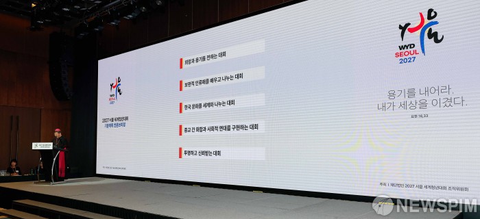 [서울=뉴스핌] 류기찬 기자 = 2027 서울 WYD 조직위원장 정순택 대주교가 27일 오전 서울 서초구 가톨릭대학교 성의교정 옴니버스파크에서 열린 ‘2027 서울 세계청년대회 기본계획 언론브리핑’에서 브리핑을 하고 있다. 2025.10.27 ryuchan0925@newspim.com