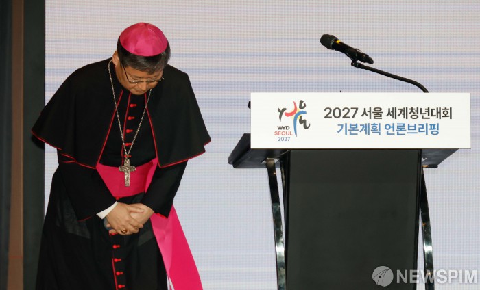 [서울=뉴스핌] 류기찬 기자 = 2027 서울 WYD 조직위원장 정순택 대주교가 27일 오전 서울 서초구 가톨릭대학교 성의교정 옴니버스파크에서 열린 '2027 서울 세계청년대회 기본계획 언론브리핑'에서 인사를 하고 있다. 2025.10.27 ryuchan0925@newspim.com