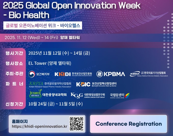 한국보건산업진흥원(보산진)은 바이오헬스 분야의 글로벌 협력과 오픈이노베이션 활성화를 목적으로 오는 11월 12일부터 11월까지 14일까지 서울 양재 엘타워에서 '2025 글로벌 오픈이노베이션 위크 바이오헬스(2025 Global Open Innovation Week Biohealth)' 컨퍼런스를 개최한다고 27일 밝혔다.