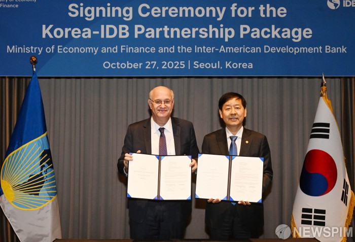 [서울=뉴스핌] 구윤철 부총리 겸 기획재정부 장관이 27일 서울 영등포구 콘래드호텔에서 일랑 고우드파잉 미주개발은행(IDB) 총재와 면담 후 '한-IDB 패키지' 의향서(LOI) 서명 후 기념사진을 찍고 있다. [사진=기획재정부] 2025.10.27 photo@newspim.com