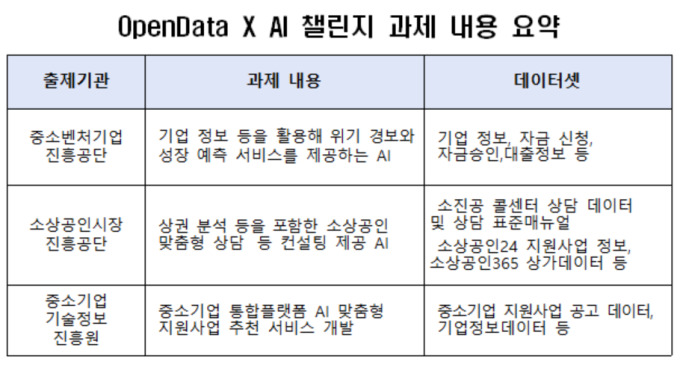 | OpenData X AI 챌린지 과제 내용 요약 [자료=중소벤처기업부] 2025.10.27 rang@newspim.com |