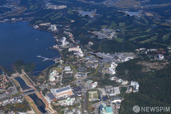 [서울=뉴스핌] 2025 경주 아시아태평양경제협력체(APEC) 정상회의를 앞둔 27일, 공군 F-35A(아래) 2기와 F-15K 2기로 구성된 편대가 공중전투초계 임무를 수행하고 있다. [사진=공군] 2025.10.27 photo@newspim.com
