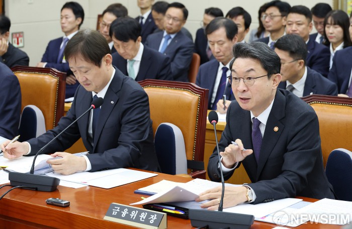 [서울=뉴스핌] 정일구 기자 = 이억원 금융위원장이 27일 오전 서울 여의도 국회 정무위원회에서 열린 금융위원회·금융감독원 등에 대한 종합감사에서 의원 질의에 답하고 있다. 2025.10.27 mironj19@newspim.com