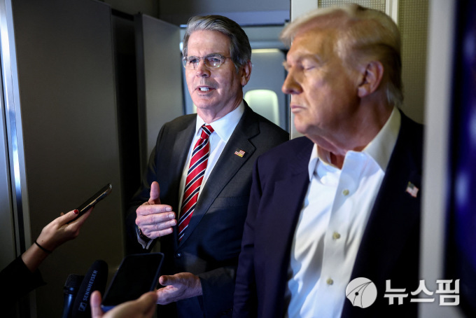 | 스콧 베센트 미국 재무장관이 27일 에어포스원 기내에서 트럼프 대통령과 함께 기자들의 질문에 답하고 있다. [사진=로이터 뉴스핌] |