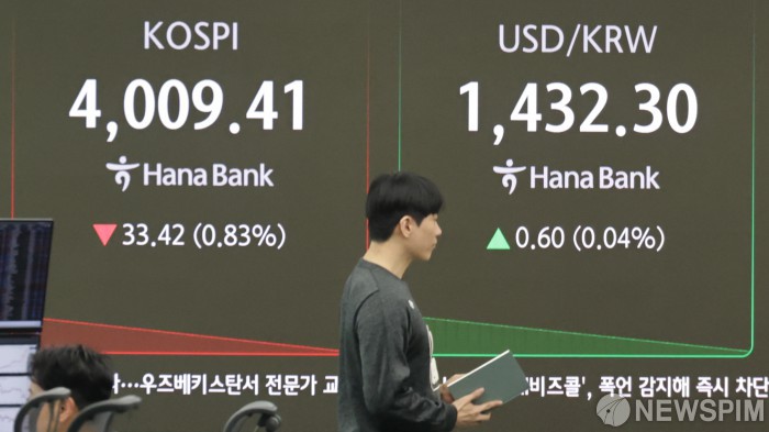 [서울=뉴스핌] 양윤모 기자 = 28일 오전 코스피가 전장 종가보다 33.42 포인트(0.83%) 하락하며 4009.41로, 코스닥은 0.77 포인트(0.09%) 하락한 901.93으로 장을 시작한 가운데, 서울 중구 하나은행 딜링룸에서 직원들이 업무를 보고 있다. 서울외환시장에서 달러/원 환율은 전장 대비 0.60원 상승한 1432.30원에 거래를 시작했다. 2025.10.28 yym58@newspim.com