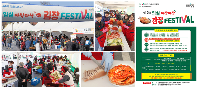 [임실=뉴스핌] 고종승 기자 = 전북 임실군이 내달 21~23일 임실치즈테마파크 일원에서 '제10회 임실 아삭아삭 김장페스티벌'을 열어 절임 배추와 양념 판매 및 김장 체험 행사를 진행한다고 28일 밝혔다.