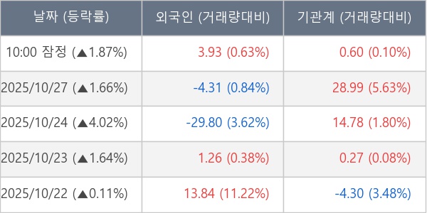 [서울=뉴스핌] 로보뉴스 = 28일 10시 15분 현재 대한전선(001440)은 외국인과 기관이 각각 3.93 만 주, 0.60 만 주 순매수(잠정) 하면서 전일 대비 1.87% (현재가 19,315원) 상승하고 있다.