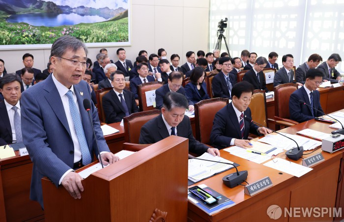 [서울=뉴스핌] 정일구 기자 = 조현 외교부 장관이 28일 오전 서울 여의도 국회 외교통일위원회에서 열린 외교부·통일부 등에 대한 종합감사에서 캄보디아 취업사기·감금 피해 대응 경과 및 조치계획 관련 긴급 현안 보고를 하고 있다. 2025.10.28 mironj19@newspim.com