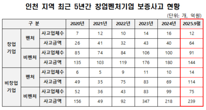 | 인천 지역 최근 5년간 창업벤처기업 보증사고 현황 [자료=허종식 의원실] 2025.10.28 rang@newspim.com |