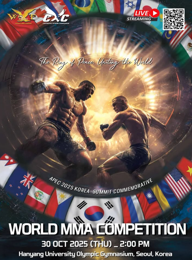 APEC 기념 세계종합격투기대회는 30일 오후 2시 서울 성동구 한양대학교 올림픽체육관에서 개막한다. 21개국 36명의 선수가 '평화의 링-하나 되는 세계'란 슬로건 아래 출전한다. UFC, 벨라토르, 원챔피언십, PFL 등 세계적인 메이저 단체에서 활약한 정상급 파이터들이 참여하며, 경기는 4분 3라운드 단판 매치로 진행된다. 관람객은 누구나 무료 입장이 가능하다.