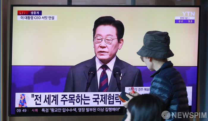 [서울=뉴스핌] 이형석 기자 = 이재명 대통령이 29일 오전 경북 경주 화백컨벤션센터에서 열린 2025년 APEC CEO 서밋에서 특별연설을 했다. 이날 서울역에서 시민들이 TV중계를 시청하고 있다. 2025.10.29 leehs@newspim.com