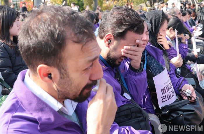 [서울=뉴스핌] 이길동 기자 = 이태원 참사 외국인 희생자 유가족들이 29일 오전 서울 종로구 광화문 광장에서 열린 10.29 이태원 참사 3주기 기억식에서 흐르는 눈물을 닦고 있다.2025.10.29gdlee@newspim.com
