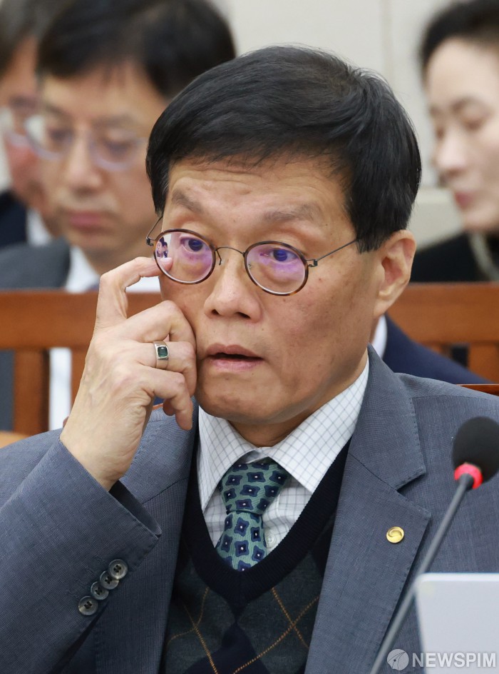 [서울=뉴스핌] 김학선 기자 = 이창용 한국은행 총재가 29일 국회 기획재정위원회에서 열린 한국은행·국세청·관세청 등에 대한 종합감사에서 의원 질의를 듣고 있다. 2025.10.29 yooksa@newspim.com