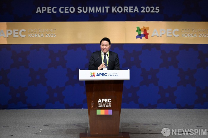 [서울=뉴스핌] 최태원 대한상의 회장이 29일 오전 경북 경주 화백컨벤션센터에서 열린 2025년 APEC CEO 서밋에서 개회사를 하고 있다. [사진=APEC 2025 KOREA & 연합뉴스] 2025.10.29 photo@newspim.com