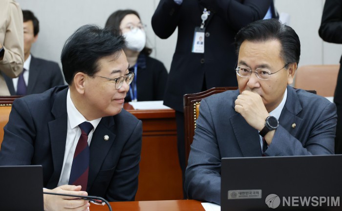 [서울=뉴스핌] 정일구 기자 = 송언석 국민의힘 원내대표와 유상범 원내운영수석부대표가 29일 서울 여의도 국회에서 열린 운영위원회 전체회의에서 대화하고 있다. 2025.10.29 mironj19@newspim.com