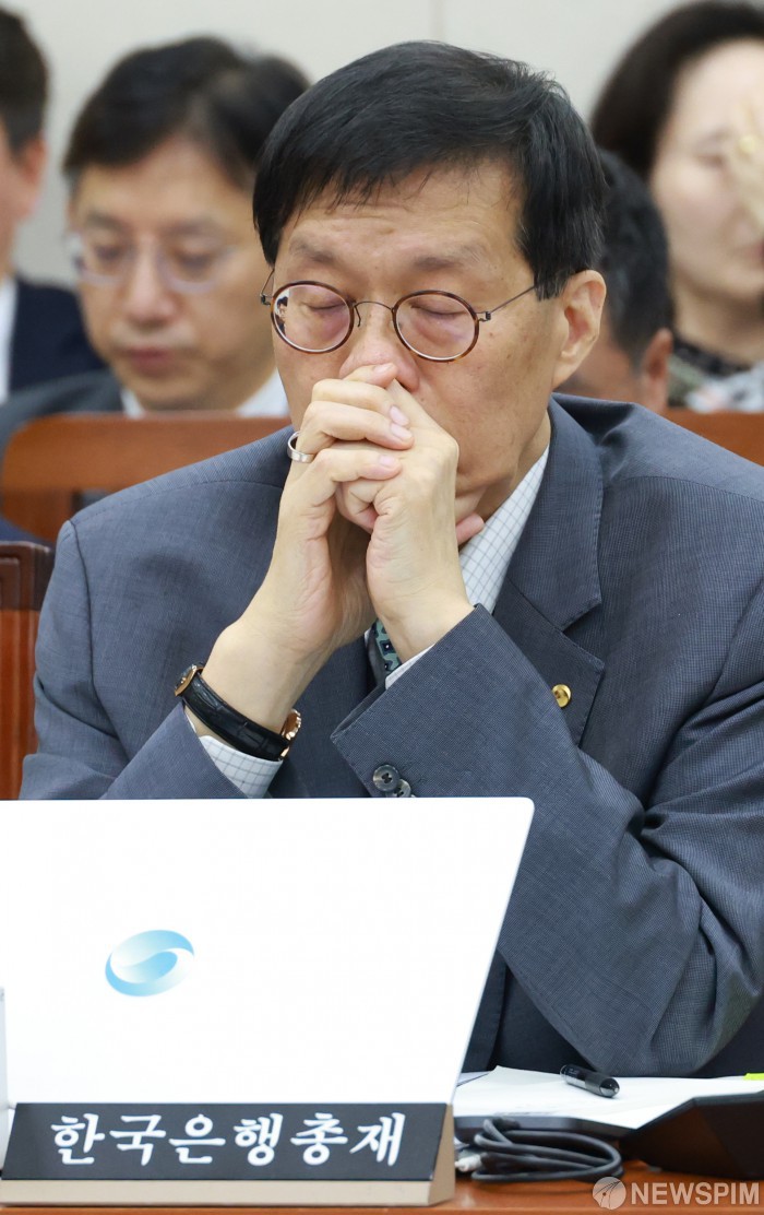 [서울=뉴스핌] 김학선 기자 = 이창용 한국은행 총재가 29일 국회 기획재정위원회에서 열린 한국은행·국세청·관세청 등에 대한 종합감사에서 의원 질의를 듣고 있다. 2025.10.29 yooksa@newspim.com