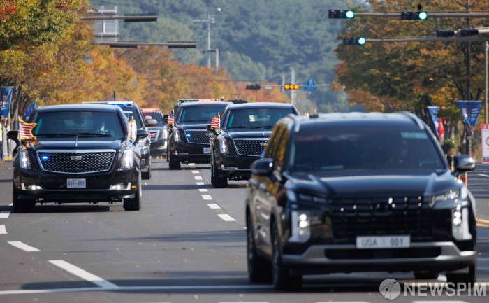 [경주=뉴스핌] 윤창빈 기자 = 도널드 트럼프 미국 대통령이 탑승한 차량 행렬이 29일 경북 경주시 국립경주박물관에서 열린 한미정상회담에 참석하고 있다. 2025.10.29 pangbin@newspim.com