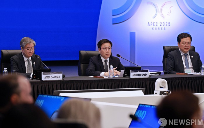 [서울=뉴스핌] 여한구 산업통상부 통상교섭본부장이 30일 경주 소노캄에서 열린 APEC 합동각료회의(AMM) 본회의에서 개회사를 하고 있다. [사진=APEC 2025 KOREA & 연합뉴스] 2025.10.30 photo@newspim.com