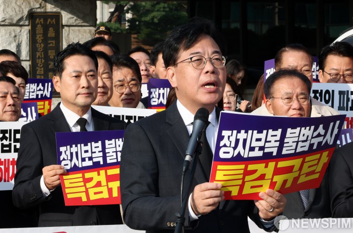 [서울=뉴스핌] 최지환 기자 = 송언석 국민의힘 원내대표가 30일 오전 서울 서초구 서울고등검찰청 앞에서 열린 국민의힘 긴급의총에서 발언하고 있다. 2025.10.30 choipix16@newspim.com