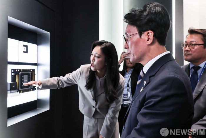 김민석 국무총리가 30일 경북 경주시 경주엑스포대공원에 마련된 2025 경주 APEC K-테크 쇼케이스에서 삼성전자의 HBM4를 살펴보고 있다.
