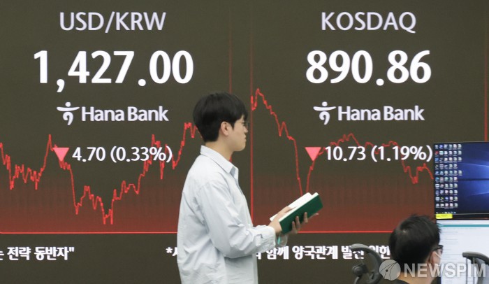 [서울=뉴스핌] 양윤모 기자 = 경주 APEC에서 한·미 관세협상이 타결된 가운데, 30일 오후 코스피가 전장 종가보다 5.74 포인트(0.14%) 상승하며 4086.89로, 코스닥은 10.73 포인트(1.19%) 하락한 890.86으로 장을 마감한 가운데, 서울 중구 하나은행 딜링룸에서 직원들이 업무를 보고 있다. 서울외환시장에서 달러/원 환율은 전장 대비 4.70원 하락한 1427.00원에 거래를 마감했다. 2025.10.30 yym58@newspim.com