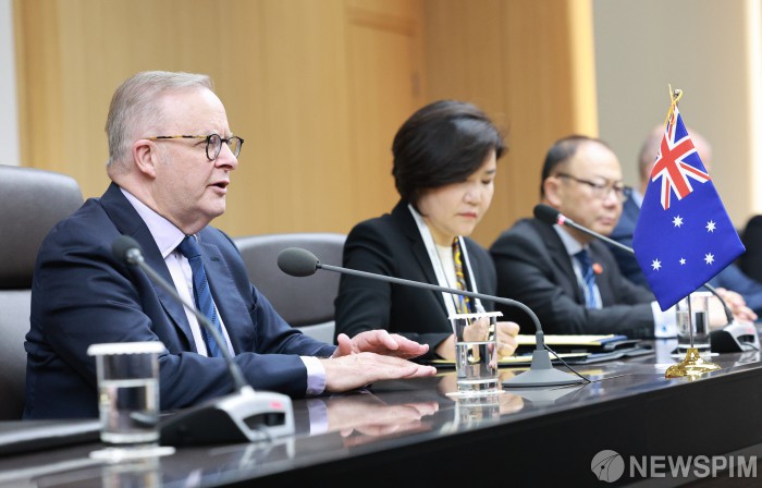[서울=뉴스핌] 앤서니 앨버니지 호주 총리가 30일 오후 경북 경주시 APEC 정상회의장에서 열린 이재명 대통령과의 정상회담에서 발언을 하고 있다. [사진=APEC 2025 KOREA & 연합뉴스] 2025.10.30 photo@newspim.com