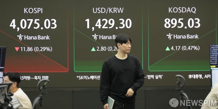 [서울=뉴스핌] 양윤모 기자 = 경주 APEC 정상회의 공식 개막일인 31일 오전 코스피가 전장 종가보다 11.86 포인트(0.29%) 하락하며 4075.03로, 코스닥은 4.17포인트(0.47%) 상승한 895.03으로 장을 시작한 가운데, 서울 중구 하나은행 딜링룸에서 직원들이 업무를 보고 있다. 서울외환시장에서 달러/원 환율은 전장 대비 2.80원 상승한 1429.30원에 거래를 시작했다. 2025.10.31 yym58@newspim.com