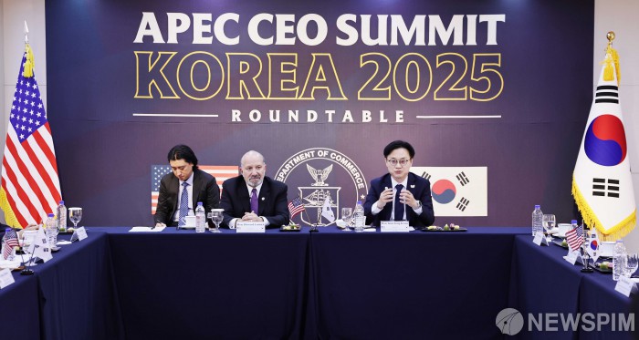 [서울=뉴스핌] 김정관 산업통상부 장관이 지난 29일 경북 경주시 예술의 전당에서 열린 서밋 비즈니스 라운드테이블에서 발언을 하고 있다. 이날 라운드테이블에는 하워드 러트닉(Howard Lutnick) 상무부 장관과 이재용 삼성전자 회장, 정의선 현대자동차그룹 회장, 최태원 SK 회장 등 국내 주요기업 CEO가 참석했다. [사진=산업통상부] 2025.10.31 photo@newspim.com