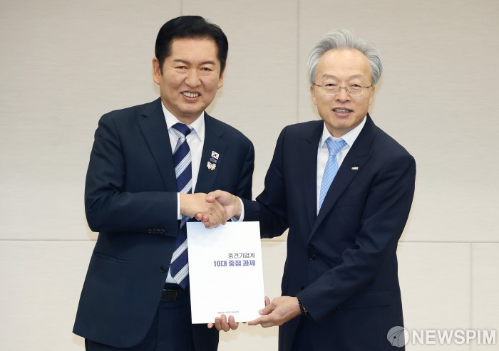 [서울=뉴스핌] 정일구 기자 = 정청래 더불어민주당 대표가 31일 오전 서울 마포구 상장회사회관에서 열린 더불어민주당-한국중견기업연합회 정책간담회에서 최진식 한국중견기업연합회 회장으로부터 제언집을 전달 받은 뒤 기념촬영을 하고 있다. 2025.10.31 mironj19@newspim.com