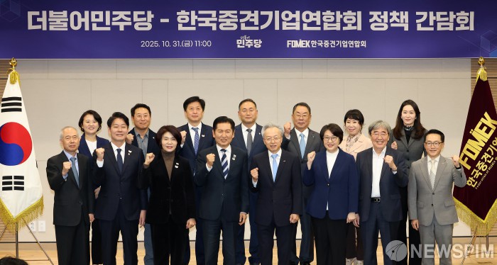 [서울=뉴스핌] 정일구 기자 = 정청래 더불어민주당 대표와 최진식 한국중견기업연합회 회장이 31일 오전 서울 마포구 상장회사회관에서 열린 더불어민주당-한국중견기업연합회 정책간담회에서 참석자들과 기념촬영을 하고 있다. 2025.10.31 mironj19@newspim.com