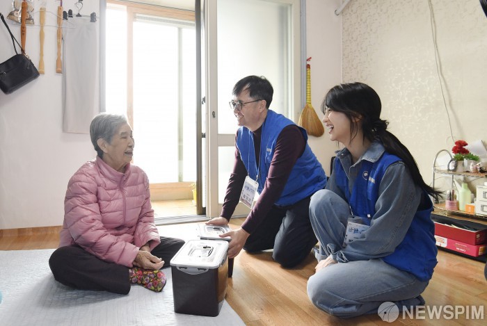 [서울=뉴스핌] 박하선 행복공감봉사단장이 31일 서울 강서구 강서노인종합복지관에서 열린 '제18기 행복공감봉사단 5차 봉사활동'에서 거동불편 독거 어르신에게 김치를 전달하고 있다. [사진=기획재정부] 2025.10.31 photo@newspim.com